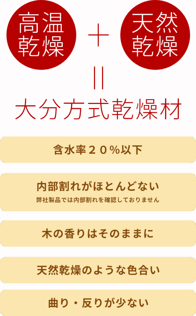 大分方式乾燥とは、大分県林業試験場で開発した乾燥法で高温セット処理と天然乾燥を組み合わせた、高品質の乾燥材生産方式です。この方式による乾燥材は内部割れがほとんどないなど理想的な乾燥材です。