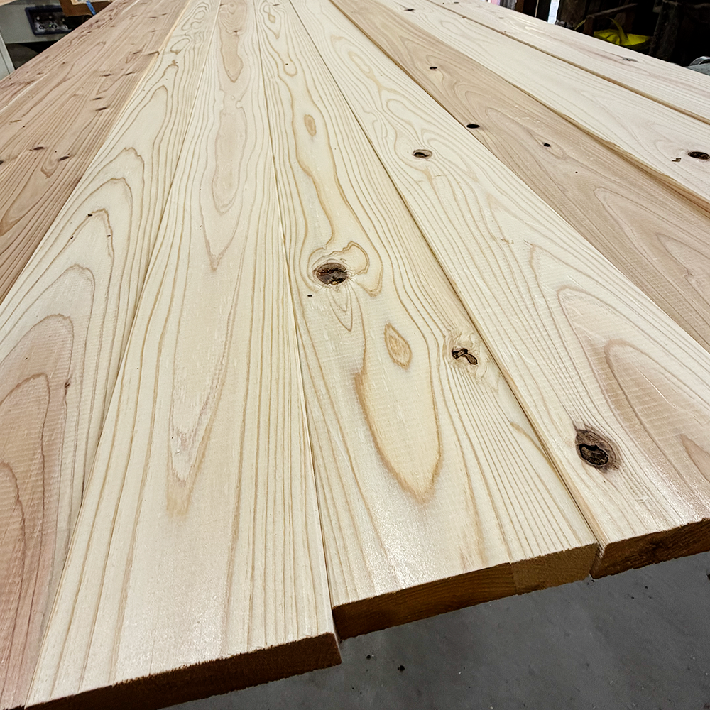 天然乾燥後に仕上げ乾燥を行っています。十分な天然乾燥を行った後の仕上げ乾燥では極力温度を低く抑えています。含水率が低く天然乾燥材の色艶と香りが残っています。